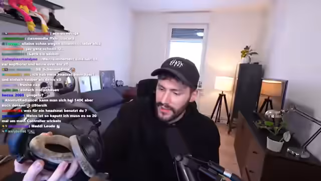 00:07:02Ein langes Gespräch entsteht rund um das Zustand des alten Headsets des Streamers, das seit 2018 benutzt wird. Der Streamer offenbart, dass er die abnehmbaren Polster erst jetzt entdeckt hat und jahrelang mit Schmutz und Wrestling-Fett gelebt hat. Es folgt eine humorvolle Aufforderung an den Chat, via Discord Bilder von den eigenen, dreckigen Headsets zu schicken. Die anschließende öffentliche Bewertung der Kopfhörer führt zu einem regelreiten Wettbewerb um das 'ekligste' Gerät, bei dem besonders makabre Defekte und Eigenreparaturen gezeigt und verspottet werden.
