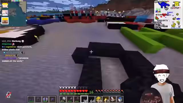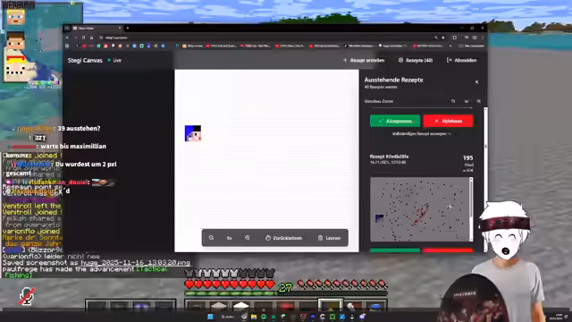 04:55:20Der Pikachu wird nach einem Griefing repariert, was teure Materialien wie Yellow Terracotta erfordert. Dies führt zu Bedenken, ob das Projekt überhaupt noch gebaut werden kann, da der Pikachu im Weg ist. Gleichzeitig werden weitere Spenden für 17 Euro und 200 Euro verarbeitet, um neue Pixel-Arts wie eine 'Superfrosch'-Figur zu realisieren.