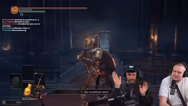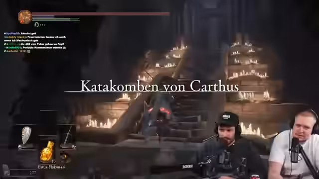 00:22:49Während des Streams wird ein neuer Spieler namens Patrick in das Spiel Dark Souls eingeführt. Der Streamer agiert als Coach und Guide, erklärt grundlegende Mechaniken wie das Leveln von Waffen, das Nutzen von Titanitscherben und das Überwinden von gefährlichen Gegnern. Er geht sehr detailliert auf die Spielwelt ein, zeigt wichtige Orte, Items und Bosskämpfe und gibt praktische Taktiken für den Kampf gegen spezielle Gegner wie z.B. die "Riesen". Der Fokus liegt dabei darauf, Patrick sicher durch das Early Game zu führen und ihm die Spielmechaniken zu vermitteln.
