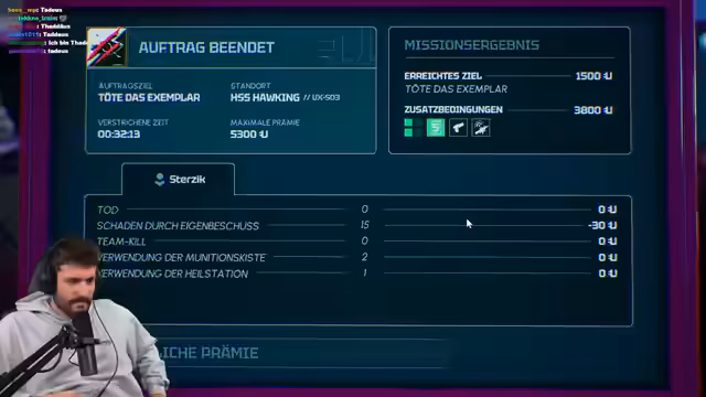 01:28:40Nach dem missglückten Start und dem Tod eines Spielers wird die Runde neu gestartet, um allen die Teilnahme zu ermöglichen. Es wird kurz über die Möglichkeit gesprochen, eine neue Lobby zu eröffnen. Der Host startet die Mission erneut, um die volle Teamstärke zu gewährleisten. Währenddessen kommt es zu Scherzen über das Essen von Proteinballs und die hohe Stimme eines Spielers. Ein Spieler beschwert sich, dass er nicht aufhören oder wegfliegen kann, wenn eine Mission einmal gestartet ist, und sein Spiel stürzt ab. Nach dem Absturz wird das Spiel erneut gestartet, und die Spieler versichern sich, dass Friendly Fire deaktiviert ist. Es wird eine Anekdote über einen Twitter-Fehler von Gnu erzählt, die Stern-TV markierte. Die Spieler begeben sich erneut in den Missionsraum, um den Auftrag „Töte das Exemplar“ anzunehmen. Es wird über die Anstrengung des Lachens während eines Gruselspiels diskutiert, und ein Spieler stirbt erneut, was zu weiteren Diskussionen führt.