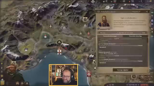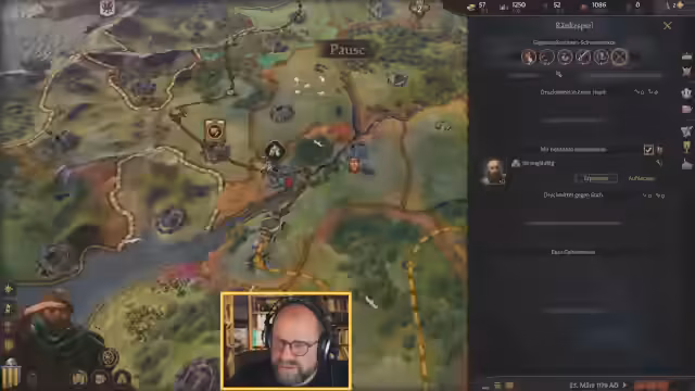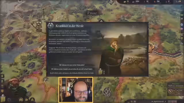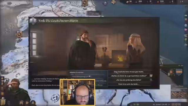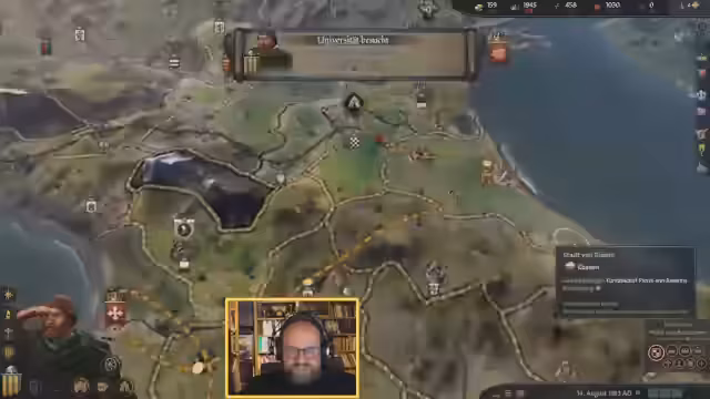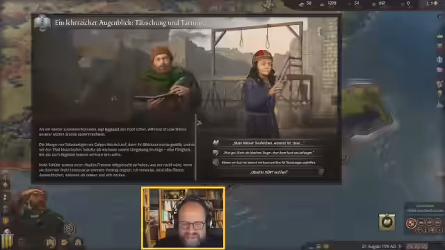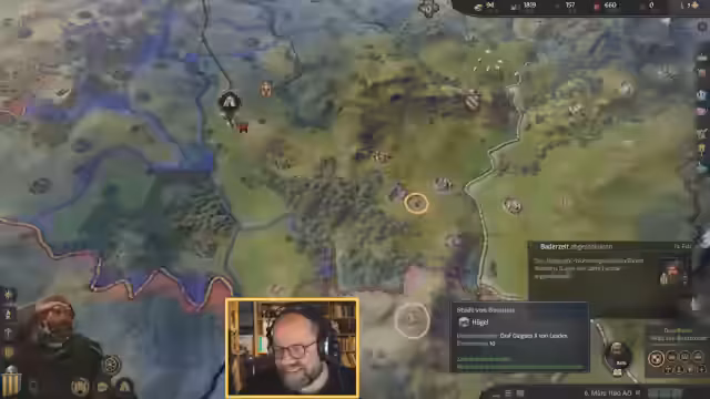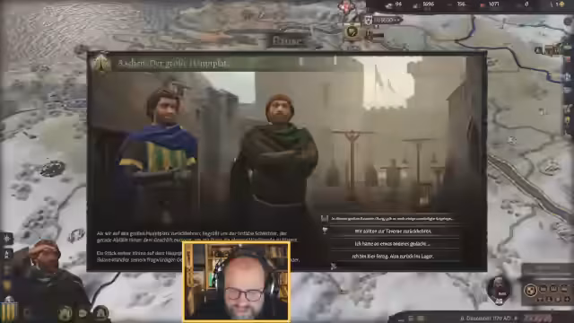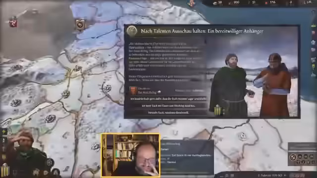 02:30:14Die lange Projektdauer zwingt zum Verweilen, um die Erfolgschancen zu erhöhen. Aus Langweile wird eine Karte der Region Lothring gezeichnet, was jedoch zu Anspannung führt und abgebrochen wird. Der Wunsch, neue Kulturen zu erkunden, führt zu dem Versuch, Arabisch zu lernen, was einen neuen jüdischen Gefolgsmann einbringt. Der Versuch, einen störenden Gast mit Diplomatie loszuwerden, scheitert, weshalb Gewalt eingesetzt wird, was aber mit 15 Gold gelingt.
