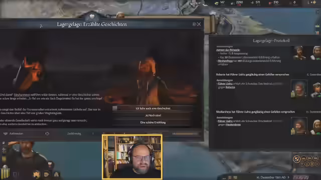 02:22:44Aufgrund unzureichender Vorräte wird die Route geändert und ein Zwischenstopp in Südfrankrieg eingelegt. Neben Vorräten erhält der Mönch Ualric neue Begleiterin Schluida, eine kluge und ehrgeizige Verwalterin. Währenddessen wird der Hygienemuffel Robert als ineffizient entlarvt, was zu einer Diskussion über seine weiteren Aufgaben im Lager führt. Gleichzeitig werden die Pläne für ein Bauvorhaben kritisch hinterfragt und die vorhandenen Agenten für das Vorhaben analysiert.