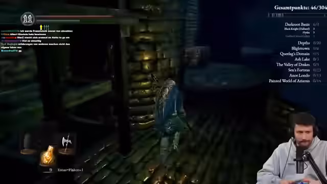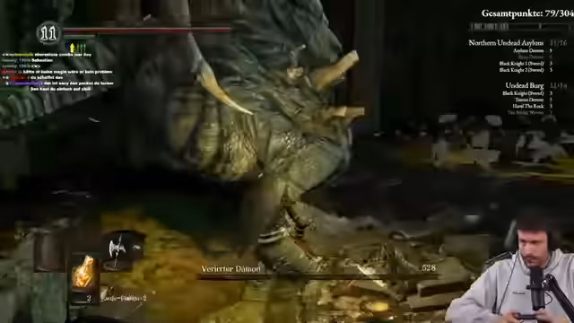 01:55:31Nach der philosophischen Einleitung konzentriert sich der Stream auf das Spielgeschehen im Dark Souls. Er kämpft sich erfolgreich durch verschiedene Gegner, darunter einen Finstergeist-Ritter und einen Klappdrachen, wobei sein Steinmann-Charakter durch Rüstungsschäden auffällt. Parallel dazu gibt es Raids von anderen Streamern wie 'Big Baba Bobo', die im Chat begrüßt werden. Während des Gameplays tauchen immer wieder technische und spielerische Herausforderungen auf, wie das Finden bestimmter Gegner oder das Verwalten von Ressourcen wie Estus, was den anspruchsvollen Charakter des Spiels zeigt.