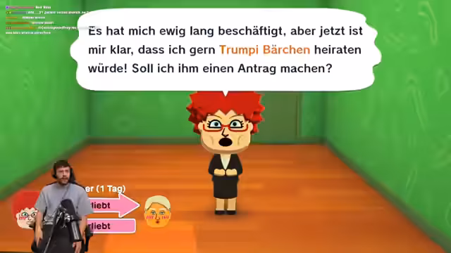 04:17:48Der Stream zeigt eine Vielzahl von Charakterinteraktionen in Tomodachi Life. Solle zeigt sich überrascht über seine Tauchausrüstung, verschiedene Charaktere wie Gnu, die Oma gegen rechts und andere interagieren miteinander. Es entstehen neue Freundschaften, wie zwischen Harald Glöckler und Barbara Salesch, nachdem sie über das Thema Organehandel sprechen. Auch Markus Rühl und Max entwickeln eine Beziehung, nachdem Max seine Liebe gesteht und Markus sich für ihn entscheidet. Die Charaktere erkunden verschiedene Aktivitäten wie Riesenradfahren, unterhalten sich über skurrile Themen wie Donald Trump und diskutieren über ihren Lebensstil.