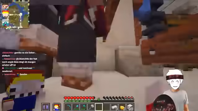 00:20:31Eine Rettungsmission wird geplant. Der Streamer sucht nach seinen Chunk-Loadern, um zu der Position zurückzukehren, an der er eingeloggt hat. Gemeinsam mit Heiko und Paul als Pilot wird ein detaillierter Plan ausgearbeitet. Paul, der selbst Erfahrung mit dem Flug hat, übernimmt die Rolle des Piloten und muss den Streamer im freien Fall mit einem Happy Ghast aufnehmen, was eine präzise Flugnavigation erfordert.
