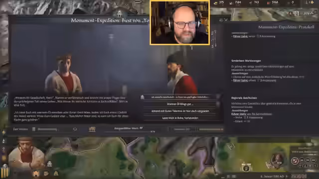 00:41:18Bevor die Reise weitergeht, stellt der Streamer die zwölf Anhänger von Walrik vor. Dazu gehören Amram der Diplomat, Mesha Shea der Leibarzt, Shluida die Karawanführerin und Tanri Vermes der Philosoph mit seinem Glauben an die Maturidia. Das langfristige Ziel Walriks ist es, den Kaiser von China zu erreichen, in seine Dienste zu treten und ein Reisebuch zu schreiben.