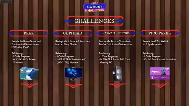 00:25:19Der Wechsel ins finale Level erfolgt. Ein Moderator begrüßt die Streamer, darunter Stegi, Maluna, No Way, Nika und Lost Kitten, sowie einen weiteren Teilnehmer namens Zeus. Die Zielsetzung des Events wird klar beschrieben: Es geht um die Jagd nach einem „Good Game für Alle“ über das gesamte Jahr hinweg. In diesem finalen Level müssen die Streamer vier verschiedene Spiele – Peak, Cuphead, Rayman Legends und Pico Park 2 – absolvieren, um am Ende einen Code freizuschalten. Für die Zuschauer gibt es in Verbindung mit jeder abgeschlossenen Challenge Giveaways.