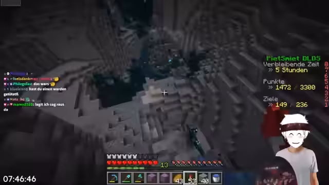 02:45:30Ein langanhaltender Teil des Streams konzentrierte sich auf das Farmen von Mobs im Nether. Es wurden Versuche unternommen, Drops wie den Trident von Creepern zu farmen. Bei einem der ersten Versuche gelang es, einen verzauberten Trident mit der Treue-Verzauberung zu looten. Auch wurde ein Gecko-Ei in einem Dorf gesichert und es gab Überlegungen, ob man es weiter züchten sollte.