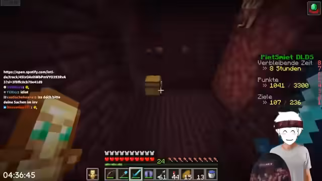 04:34:13Es kommt erneut zu einem Minecraft-Absturz, der Sorge bereitet, ausgeloggt zu sein. Nach dem Neustart stellt sich heraus, dass der Spieler sich neben einem Warden ausgeloggt hat. Nach einem weiteren Absturz und Neustart entdeckt der Spieler eine Trial-Ruine, was als Erfolg gewertet wird. Es wird kurz diskutiert, dass in der Ruine das Armored-Trim gefunden werden kann. Der Spieler macht sich auf den Weg, Katzen zu züchten, hat aber Probleme, da die Katzen immer wieder weglaufen. Es kommt zu einem weiteren Absturz.