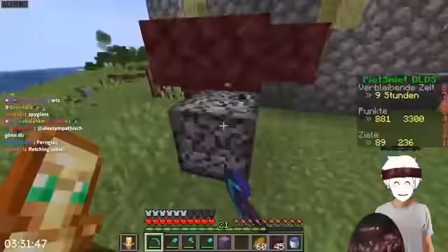 02:56:56Nach einigen Rückschlägen beschloss man, eine Nether-Basis zu gründen. Es wurden Überlegungen angestellt, ob man zuerst eine Nether-Farm für Schwarzpulver oder direkt weiter farmen sollte. Die Koordinaten der Basis im Nether wurden festgelegt (620, 290), und es wurde ein Hafen am Portal für zukünftige Expeditionen eingerichtet. Man lootete dabei auch in einer nahegelegenen Bastion, um Materialien zu sammeln.