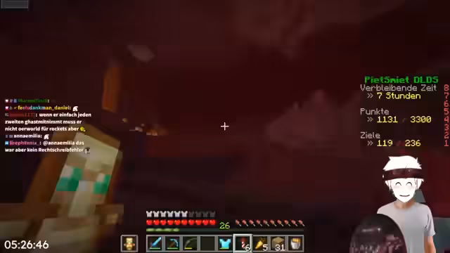 01:23:40Der Stream konzentriert sich auf den Nether-Grind. Man findet eine Bastion, allerdings eine als hässlich empfundene, und lootet Schmiedevorlagen sowie Kisten mit wertvollen Gegenständen. Es wird Ancient Debris entdeckt und im Chat über Handelsmöglichkeiten mit Piglins diskutiert, insbesondere um das benötigte Crying Obsidian zu erhalten. Der Fokus liegt auf dem Sammeln von Ressourcen und der Vorbereitung für den Bau eines Beacons.