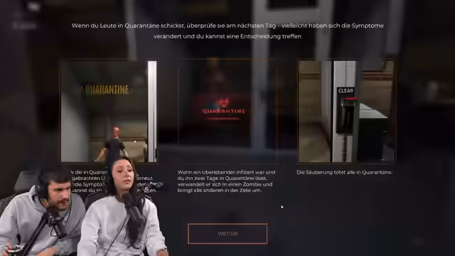 00:03:08Der Hauptteil des Streams widmet sich dem Survival-Horror-Spiel 'Quarantine Zone'. Nach einer Vorstellung des Spiels, bei dem es darum geht, überlebende auf eine Infektion mit einem Zombie-Virus zu scannen, beginnt das eigentliche Gameplay. Der Streamer und sein Mitspieler müssen die ankommenden Personen auf Symptome wie Ausschlag, rote Haut oder blaue Flecken untersuchen. Entscheidungen werden getroffen, ob die Personen in die Quarantäne geschickt oder eliminiert werden. Ein erstes Opfer wird fälschlicherweise erschossen, was zu einem Geldverlust führt und für Diskussionen über die Schwere von Fehlentscheidungen sorgt.