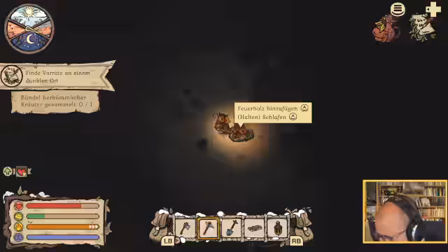 03:16:54Der Spieler begibt sich auf die Suche nach weiteren Steinen und erreicht schließlich das Gebiet, in dem es in die Dunkelheit geht. Dort findet er einen Rucksack, Pinienholz und Eichelkekse, wobei das Inventar schnell voll wird. Ein wichtiger Fund ist ein Stein mit einem Loch, der sich als mobiles Lagerfeuer entpuppt – ein sehr nützlicher Gegenstand. Die Quest führt den Spieler zu einem merkwürdig aussehenden Stein, der sich als der von Nagelzahn erwähnte Hexenstein herausstellt. Nachdem der Spieler das Inventar durch den Verzehr von Fritterlingen leert, kann er den Stein aufnehmen und sich auf den Rückweg machen, um sich aufzuwärmen. Die erfolgreiche Suche nach dem Versteck von Nagelzahn belohnt den Spieler mit besseren Gegenständen, die eine längere Ausdauer ermöglichen. Nagelzahn verrät anschließend den Standort des Eulen-Nests auf einer riesigen Pinie, wo der Spieler drei Eulenküken findet und Tantchen rettet, die sich vor den hungrigen Eulen versteckt hatte. Die Heimreise mit Tantchen ist beschwerlich, doch die Mühe lohnt sich, da Tantchen gerettet werden kann und der Spieler neue Gegenstände wie eine bessere Axt, seltene Kräuter, Granit und Flaxgarn erhält.