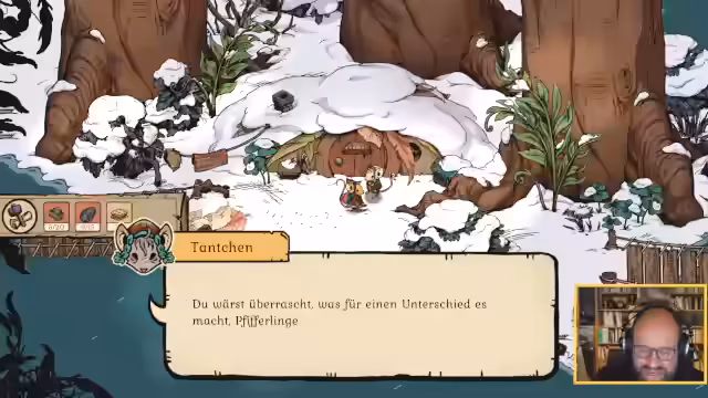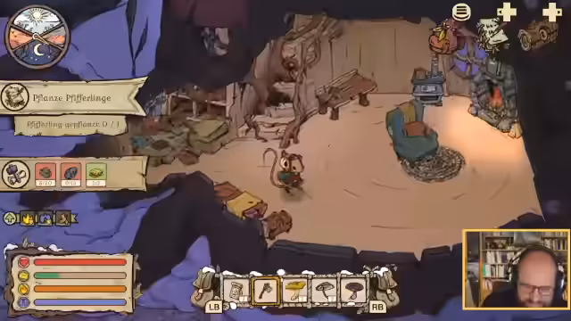 01:44:24Die Maus stellt eine Sandsteinschaufel her, um Löcher im Schnee zu graben, und plant, auch einen Stuhl zu bauen. Kurz darauf wird Tante Betulina von einer Eule entführt, und die Maus muss die Verfolgung aufnehmen. Auf der Suche nach der Eule entdeckt die Maus einen Außenposten, wo sie Brennholz herstellen und schlafen kann. Das Inventar ist schnell voll, und die Maus muss entscheiden, welche Gegenstände sie fallen lässt, um Platz für wichtigere Dinge zu schaffen. Während der Suche wird es dunkel und kalt, was die Maus zwingt, ein Feuer zu entfachen, um warm zu bleiben. Die Maus kämpft gegen gefährliche Käfer und versucht, systematisch vorzugehen, um Tante Betulina zu finden. Die Suche führt sie zu einem Frosch namens Bufo, der Hilfe beim Wiederaufbau seines Hauses benötigt.