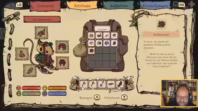 02:23:05Nach einer erholsamen Nacht und dem Verzehr eines Blaubeerkuchens bricht die Maus zu den Schattenpinien auf, um Tante Betulina zu finden. Sie rüstet sich mit einem Wanderrucksack und ausreichend Brennholz aus. Auf dem Weg begegnet sie erneut Feinden und muss ihr Inventar sorgfältig verwalten. Die Maus entdeckt eine Lagerfeuerausrüstung, mit der sie unterwegs Feuer machen kann, und einen Schal, der in einem Baum verloren wurde. Sie versucht, an verschiedenen Stellen zu graben, stellt aber fest, dass sie eine bessere Schaufel benötigt. Die Suche führt sie zu einem Eichhörnchen namens Brausi, das ebenfalls seine Vorräte verloren hat und Hilfe beim Wiederfinden benötigt. Das Eichhörnchen gibt der Maus eine Laterne und Hinweise auf versteckte Vorräte, die sich in dunklen Ecken des Pinienwaldes befinden sollen.