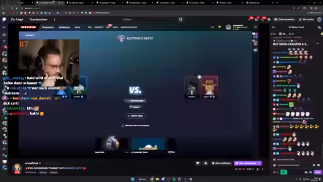 00:32:31Während des laufenden Turniers treten erhebliche technische Probleme auf, die den Stream beeinträchtigen. Es kommt zu einem 'Blue Screen', der den Stream unterbricht, und laute, störende Systemgeräusche erschweren die Konzentration. Parallel dazu beginnen die ersten Begegnungen. Das erste Match gegen Sidney und Willi wird als sehr intensiv und knapp beschrieben, wobei das eigene Team knapp gewinnt. Ein anderer Gegner, Feister und Marcel, verliert überraschend früh gegen ein als Underdog geltendes Team.