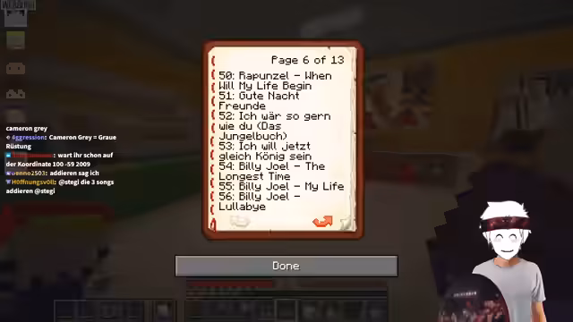 02:54:06Die finale Drachenei-Schnitzeljagd beginnt. Ein entscheidender Hinweis ist ein Textur-Paket, das die Geräusche aller Schallplatten auf dem Server verändert. Der Streamer analysiert die neuen Melodien und stellt fest, dass diese Lieder wie Festungslieder klingen. Der Fokus liegt nun darauf, die Lieder von "Anke", "Billy" und "Cameron" zu identifizieren, um die Koordinaten des Dracheneis zu finden.