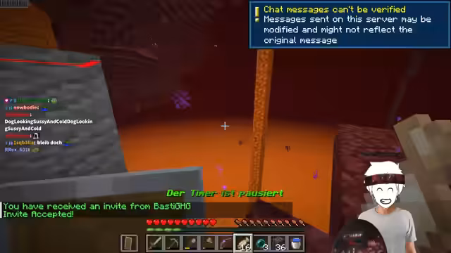 00:17:53Nachdem Basti im Stream angekommen ist, beginnt die Diskussion über die technischen Vorbereitungen für die Challenge. Beide Streamer installieren eine sogenannte Flashback-Mod, um ihre Welt zurückzusetzen, und stellen sicher, dass der Server online ist und ein Problem mit den Nether-Portalen im letzten Stream behoben wurde. Anschließend betreten sie das Minecraft-Spiel, um im Nether an der Stelle fortzufahren, an der sie das letzte Mal aufgehört hatten.