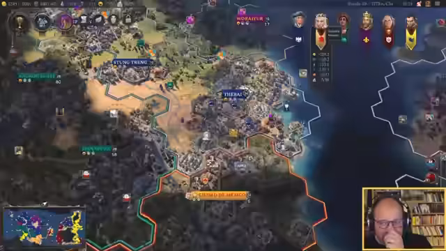 00:42:33Der Streamer analysiert die aktuelle Spielsituation. Friedrich ist auf einem Kontinent mit erbitterten Feinden (Karl und Isabella) und hat eine enge Freundschaft zu Chung-Chak. In der Neuen Welt führt der Krieg gegen Franklin und Napoleon. Das Hauptziel ist die Eroberung der Stadt Kansa, um entscheidende Punkte im Militärbereich zu sammeln, da die Punkte knapp sind und das Zeitalter bald endet.