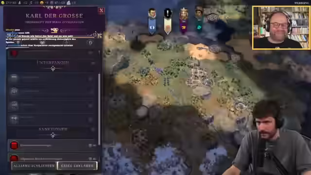 02:19:26Eine bemerkenswerte Dynamik ist, dass die vier Neulinge kaum miteinander kommunizieren, sondern hauptsächlich mit ihrem Chat. Dieser Umstand macht das klassische Weltpolitik-System von Civilization weniger relevant, was der Kommentator als Teil des Coachings thematisiert hat. Drakon möchte eine Grenzöffnung zu Sterzig, wird jedoch abgelehnt, was für ihn ungünstig ist, da er seine strategischen Pläne dadurch verändert.