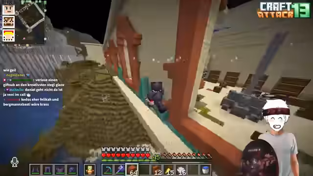 15:57:09Im Fokus der langen Nacht stand das Minecraft-Event Craft Attack 13. Die Teilnehmer sprachen über die positiven Effekte des Events, insbesondere wie es verschiedene Bubbles innerhalb der Community zusammenschweißte und neue, kreative Konstellationen ermöglichte. Besonders hervorgehoben wurden unerwartete und erfolgreiche Crossovers, die neue Dynamiken ins Spiel brachten und das Event als Bereicherung für die gesamte Craft-Attack-Community bewerteten.