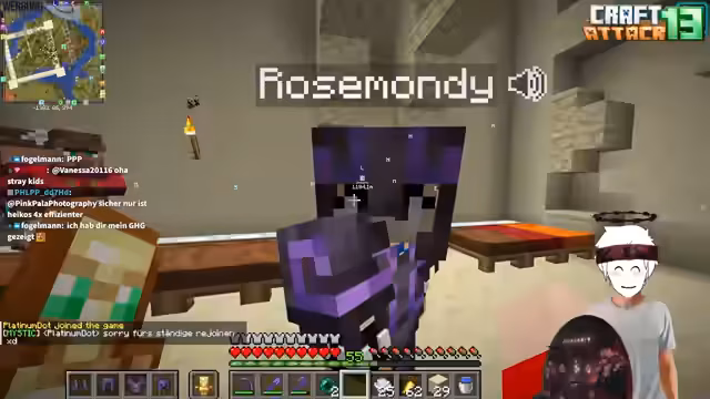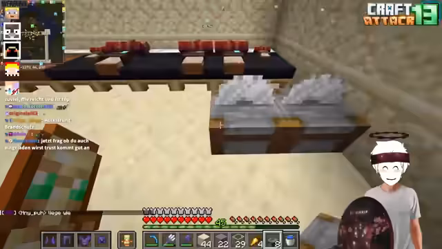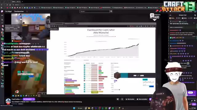 14:48:49Nach langer Zeit in Craft Attack hat Stegi ein neues Projekt ins Auge gefasst: die eigene Quizshow 'Wer wird Yamantionär?'. Dafür hat er bereits einen passenden Bereich eingerichtet und plant, speziell gestaltete Fragen zu verwenden. Die erste Kandidatin ist bereits festgelegt, und Stegi hofft, dass der Gast, Kevin, mitmacht. Er erwägt, die Reihenfolge der Kandidaten so zu gestalten, dass der erste Gast möglichst entspannt und geübt ist.