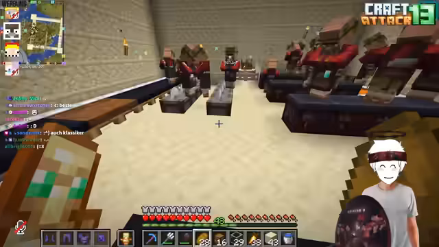 05:47:45Die Spieler diskutieren über den Bau einer effizienten Farm in Minecraft, die es ermöglichen würde, fünf Spieler AFK in die Farm zu integrieren, um alle Blöcke fertigzustellen. Dies erfordert jedoch eine komplexe Bauweise und zwei extrem zuverlässige Personen. Die Beschaffung von XP-Fläschchen wird durch den Handel mit Emeralds als machbar erachtet. Es wird überlegt, ob es sich um eine Offline-Farm handelt, bei der man lediglich die Leertaste gedrückt halten muss, um Blöcke abzubauen. Die Automatisierung von Prozessen, wie das Herstellen von Sticks, wird als „immer cool“ empfunden. Während des Baus wird festgestellt, dass ein Glasstrahl, der quer durch die Villager-Halle verläuft, optisch nicht ansprechend ist und nach außen verlegt werden sollte, um die Symmetrie zu wahren.