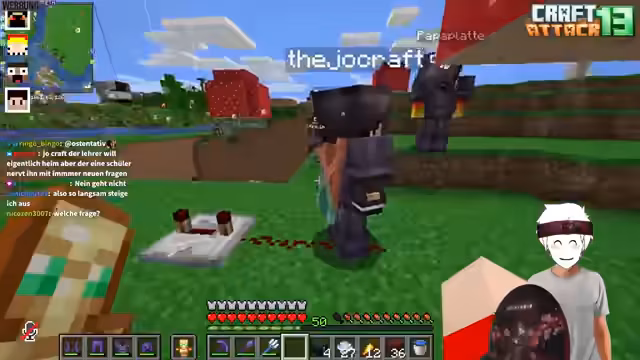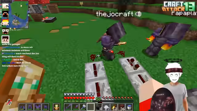10:02:14Die Gruppe tauscht sich über ihre Erfahrungen mit Redstone aus. Joe hatte Kevin und Hugo gestern Grundlagen wie Und-Gates, XOR-Schaltungen und Item-Sorter beigebracht, wobei Kevin sogar freestyle ein Und-Gate bauen musste. Joe plant, einen kompletten Craft Attack Freizeitpark zu bauen, inklusive Attraktionen wie Achterbahnen mit Loopings. Er hat bereits einen Freefall Tower und ein Wildwolf Game fertiggestellt und plant als Nächstes ein Piraten-Schießspiel und ein Horrorhaus. Die Teilnehmer können sich Attraktionen wünschen, und es wird über die technische Umsetzung von Achterbahn-Loopings in Minecraft diskutiert, die zwar nicht physisch, aber visuell simuliert werden können. Joe erwähnt, dass der Freizeitpark später Eintrittskarten erfordern wird, die mit Subs bezahlt werden können, was auf ein wiederkehrendes Muster bei Joe hindeutet, Glücksspiele mit Subs zu verknüpfen.