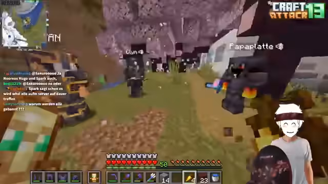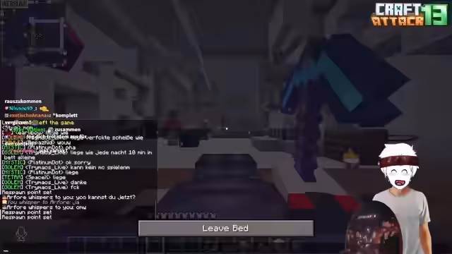 12:47:51Der Server ist im Chaos, alle drehen durch, aber der Vibe ist gut. Die Bann-Situation wird als 'lowkey funny' empfunden, da es jeden treffen könnte. Es wird über einen MLG Water Stunt gesprochen, der mit Shadern beeindruckend aussieht. Die Beerdigung wird als gelungenes Event gelobt, besonders die pinken Partikel, die währenddessen herunterfielen. Es wird die Möglichkeit einer weiteren Beerdigung am nächsten Tag erwähnt. Die Diskussion dreht sich um das Griefing auf Craft Attack und die Frage, ob der Streamer selbst ein Griefer ist. Es wird versucht, im Spiel zu schlafen, aber es gibt Schwierigkeiten, da nur eine Person sich hinlegen muss.