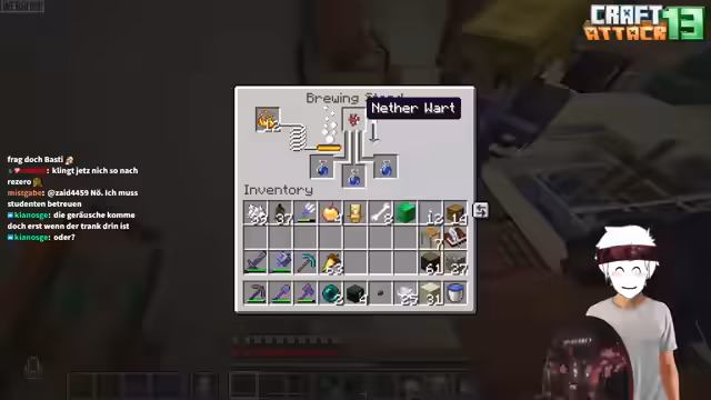 15:01:46Nachdem der Streamer sich in seiner Base wähnt, taucht Rose unerwartet auf, um ihre Waffe zu reparieren. Es stellt sich heraus, dass Rose nur einen Tod hatte, während der Streamer 14 Tode verzeichnet. Rose fragt nach einer XP-Farm, und der Streamer erklärt ihr geduldig, wie man Tränke braut und die Farm benutzt. Er zeigt ihr, wie man Wasserflaschen in Awkward Potions verwandelt und dann mit Clean Stone und Schwarzpulver zu werfbaren Splash-Potions of Infestation. Diese Tränke lassen Silberfische spawnen, wenn man Schaden nimmt, was zum Leveln in der Farm genutzt wird. Rose lernt, dass ihre Rüstung zuerst repariert wird, bevor sie Level erhält, und ist begeistert von der Effizienz der Farm.