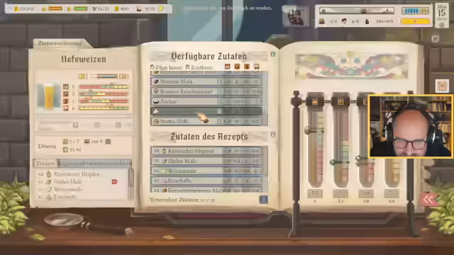 01:46:26Die Entwicklung des Fruchtbier-Rezepts gestaltet sich schwierig und erfordert eine Puzzlearbeit, um die Zutaten so zu kombinieren, dass zwei Eigenschaften im 'grünen' Bereich der Qualitätsleiste liegen. Nach verschiedenen Versuchen entscheidet sich der Streamer für eine Rezeptkombination aus Trauben, braunem Malz, Honig, starker Hefe und Grut, die die gewünschten Eigenschaften erfüllt. Parallel dazu wird das Wettbewerbsbier 'Schaumkrone' fertiggestellt, dessen Qualität durch eine göttliche Inspiration auf 57 gesteigert wurde und das nun als Goldbier im Wettbewerb starten soll. Die Vorbereitungen für die Auslieferung weiterer Auftragsbiere laufen.