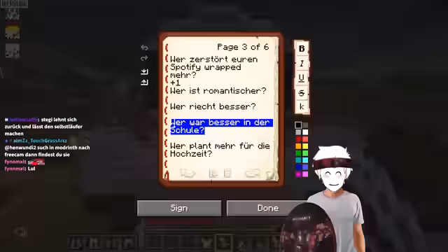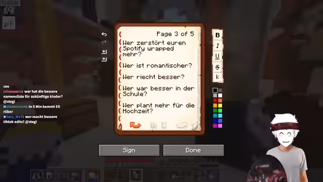 08:53:23Nachdem der Streamer das Escape Room-Rätsel erfolgreich gelöst hat, bereitet er sich auf ein Quiz mit Rohat und Rose vor. Es handelt sich um ein „Wer würde eher“-Quiz, bei dem die Teilnehmer den Namen der Person aufschreiben müssen, auf die die Frage zutrifft. Es wird betont, dass es keine „Beide“ oder „Niemand“-Antworten gibt, sondern nur Rohat oder Rose. Die Fragen sollen zu Diskussionen anregen und die Beziehung der beiden auf die Probe stellen. Es wird auch erwähnt, dass die Fragen nicht zu persönlich sein sollen, sondern eher auf Meinungen und Einschätzungen basieren. Die Teilnehmer erhalten Bücher, in die sie ihre Antworten schreiben sollen, und es wird erklärt, dass sie nach dem Stellen der Frage kurz nachdenken und dann gleichzeitig ihre Antwort nennen sollen, bevor sie diskutieren können. Die Location des Quiz ist jedoch problematisch, da dort Mobs spawnen, was die Konzentration stört. Trotzdem sind alle gespannt auf das Quiz und die kommenden Fragen.