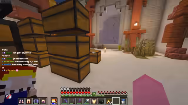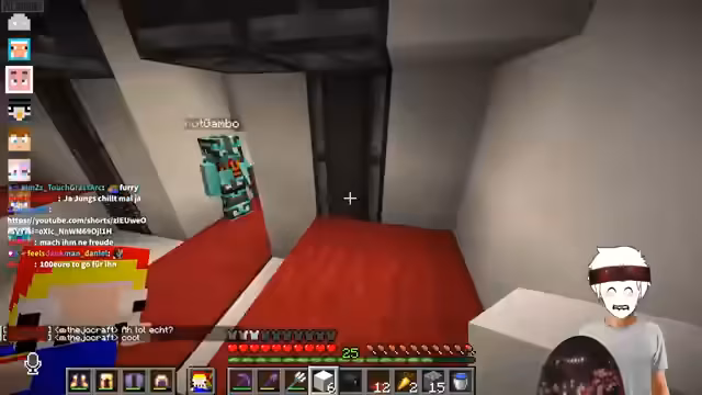 12:01:57Nach dem TNT-Spiel erkunden die Streamer die verschiedenen Würfelhäuser, die von den Teilnehmern gebaut wurden. Es wird geraten, wer welches Haus gebaut hat, und die kreativen und manchmal auch ungewöhnlichen Designs werden kommentiert. Der Streamer zeigt anschließend seinen Lieblingsprank, den er täglich auf dem Server anwendet. Dabei handelt es sich um eine Redstone-Konstruktion mit Notenblöcken und Observern, die eine nervige Melodie oder Geräusche erzeugt, um andere Spieler wie Wieland zu ärgern. Es wird diskutiert, wie man diesen Prank noch effektiver und störender gestalten kann, indem man verschiedene Sounds und Mob-Köpfe verwendet. Rose und Veto werden dazu ermutigt, den Prank ebenfalls bei Wieland anzuwenden, um seine Reaktion zu sehen und das Vermächtnis des Pranks fortzuführen.
