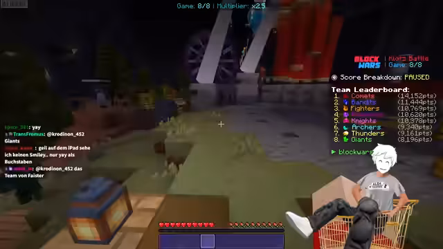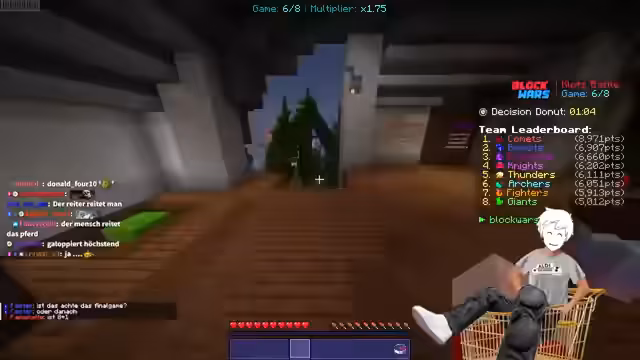 01:00:35Jedes Teammitglied soll sagen, was es mit dem Preisgeld machen würde, um die Idee zu festigen, dass sie gewinnen werden. Mr. Moore würde mit seiner Frau in den Urlaub fahren, Rose würde ihrem Papa einen Urlaub schenken, und der Streamer würde alles im Casino auf Rot setzen. Es wird eine weitere Runde im Minecraft-Turnier gespielt. Der Streamer hat versehentlich das falsche Kit gewählt und ist nun Healer. Rose hat ebenfalls das Healing Kit gewählt. Es wird beschlossen, zusammen etwas einzunehmen. Das Team wird von vielen Seiten angegriffen und geht in die Mitte. Rose fällt herunter und stirbt. Das Team ist zu früh losgerannt, ohne etwas zu sagen. Es wird festgestellt, dass Team Blau wieder aggressiv ist. Das Team wird eingekesselt und muss weg. Team Knights ist auf dem Fernsehen. Es wird beschlossen, Team Rot aus dem Weg zu gehen und in die Mitte zu gehen, wo sich auch der Healing-Atze befindet. Heiko fällt herunter und stirbt. Am Ende überleben nur noch die beiden und gewinnen.