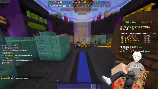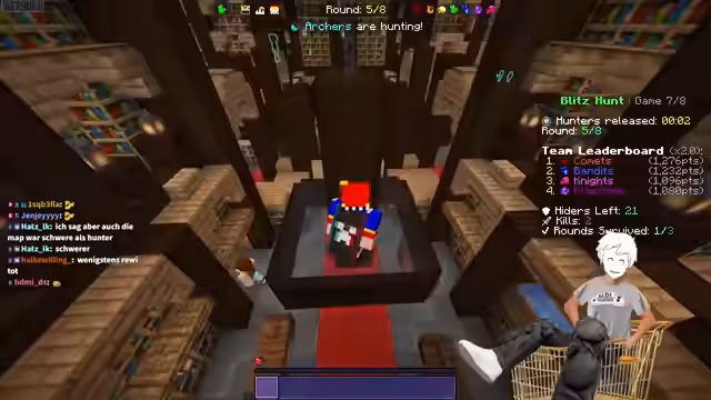 03:00:00Es wird festgestellt, dass selbst der erste Platz noch möglich ist, da es einen Multiplikator von 1,75 gibt. Es wird besprochen, dass man immer die Guten targeten muss. Wenn etwas Dunkelblaues oder Rotes gesehen wird, soll man ausrasten, besonders bei Rot, da diese 2000 Punkte mehr haben. Es wird überlegt, welches das letzte Spiel ist. Die Optionen sind Lunge, Extraction und Blitzernd. Lunge soll angeblich von Norex nicht gewonnen werden können. Blitzernd wird als Suchen und Verstecken beschrieben. Der Streamer konnte nichts wählen und hat Extraction gewählt. Blitzerler hat gewonnen. Es wird ein Video zu Blitzhunt angeschaut, einem schnellen Hide-and-Seek-Game, bei dem man sich entweder versteckt oder als Hunter auf die Suche geht. Ziel ist es, als Hider so lange wie möglich auszuweichen oder als Hunter möglichst viele Spieler zu erwischen. Jede Runde jagt ein Team die sieben anderen Teams in einer zufällig generierten Map. Es wird erklärt, dass betroffene Haider sofort eine Detected-Meldung auf dem Bildschirm sehen und eine Nachricht im Chat erhalten.