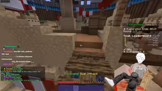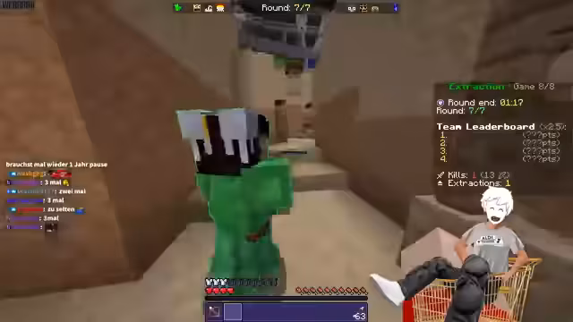 03:23:18Das Spiel ist vorbei, und es wird gehofft, dass sie nicht noch einmal suchen müssen. Sie sind letzter. Es stellt sich heraus, dass sie Platz 6 sind, was als stabil empfunden wird. Veto hat extra dafür seinen Skin gewechselt. Overall sind sie aber ziemlich letzter. Es wird befürchtet, dass sie nächstes Mal keine Einladung mehr bekommen und angespuckt werden. In Discord steht, dass die Verlierer sich gegenseitig Fußbilder schicken müssen. Der Streamer ist das erste Mal seit zehn Jahren bei einem Event dabei und hat reingeschissen, aber es hat trotzdem Spaß gemacht. Es wird gefragt, ob das jetzt die Finalrunde ist, wo nur die Besten spielen dürfen, oder ob noch jeder spielen darf. Es gibt einen 2,5x Multiplier. Es wird beschlossen, Lunge zu machen. Der Streamer tut es als letztes richtig. Er will jetzt am Ende doch wissen, was Lunge ist. Es wird sich ausgezogen. Jeder Spieler hat vier Herzen, und jeder Treffer zieht ein Herz ab. Es gibt keine automatische Heilung. Es gibt unendliche Pfeile. Extrahirn funktioniert, indem man die Sneak-Taste gedrückt hält, während man im mittleren Kreis der Map steht. Währenddessen ist man angreifbar. Nach einer erfolgreichen Extraktion ist man für den Rest der Runde Zuschauer. In der Nähe des Spawns und an den Seiten der Map liegen Items auf dem Boden. Es wird nicht gewusst, wie Leben regeneriert wird. Es wird vorgeschlagen, so schnell es geht zu versuchen zu entkommen, da am Anfang viele versuchen werden, sich hoch zu porten.