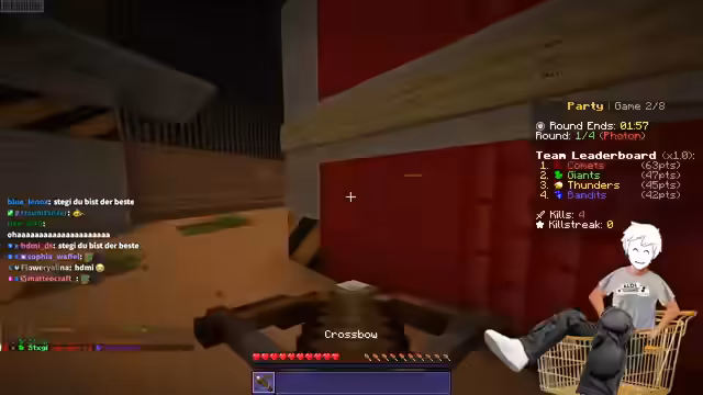 01:12:44Es wird über das nächste Spiel abgestimmt, wobei Oversplief abgelehnt und Trailblazers oder Partys bevorzugt werden. Partys gewinnt die Abstimmung. Es folgt ein Erklärvideo zum Spielmodus Party, einem rundenbasierten Spiel aus vier Minigames: Photon, Go Down, Beep Test und Crossfire. Photon ist ein Quake-ähnliches Spiel mit Armbrüsten und Puffstreaks, Beep Test ein Parcours-basiertes Survival-Game, und Crossfire beinhaltet das Steigen auf Sand, unter dem Magma lauert. Das Video wird von Dominik präsentiert und als unterhaltsam empfunden. Nach dem Video beginnt das Spiel Quake, bei dem jeder Spieler alleine kämpfen muss und es auf schnelles Schießen ankommt. Spawns campen ist eine beliebte Taktik.