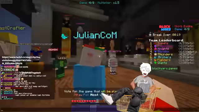 00:44:24Das erste Spiel des Minecraft-Turniers beginnt, und es wird "Slot Battle" gespielt. Es werden Kamerafahrten und Cinematics gelobt. Der Streamer erklärt die Regeln des Turniers, bei dem in acht Spielen Punkte gesammelt werden können und die zwei besten Teams im Finale in "Shockwave" (Counter-Strike) gegeneinander antreten. Die Punkte und Ranglisten werden bis zum Finale versteckt. Die Teams werden vorgestellt, darunter "GroKo", "Niek Beats" und das eigene Team. Der Streamer und seine Mitspieler haben sich eine Kür überlegt. Es wird das Spielprinzip von "Oversbrief" erklärt, bei dem Blöcke unter den Gegnern abgebaut werden müssen, damit diese herunterfallen. Der Streamer versteht das Spielprinzip nicht sofort und bittet den Chat um Hilfe. Es wird über die Wahl der Kits diskutiert, wobei jedes Kit nur einmal benutzt werden darf.