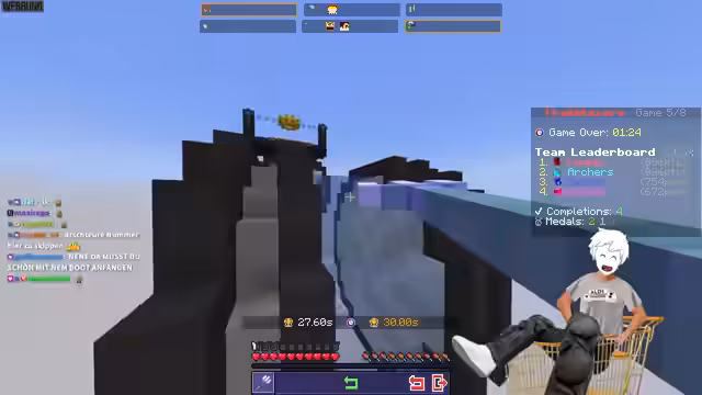 02:22:57Es wird diskutiert, ob es sich lohnt, ein Video über die aktuelle Situation zu machen, wobei der Chat geteilter Meinung ist. Der Streamer betont, dass die Spielmodi Spaß machen, besonders das Backen oder Kochen mit Ausliefern. Trailblazers wird als Movement Game vorgestellt, bei dem man zwischen sechs verschiedenen Arten von Bewegungsleveln wählen kann. Alle Spieler starten in einem Hub mit Röhren, die zu den verschiedenen Movement-Typen führen. Es gibt zwei Kategorien: Completion und Time Trial. Die Completion-Kategorie umfasst Parkour, Dropper und Elytra-Kurse. Jeder Schwierigkeitsgrad hat eine eigene Herausforderung. Es wird angemerkt, dass der Spielmodus so komplex gemacht wurde, dass ihn niemand versteht. Der Streamer schlägt einen Deal vor, für das nächste Spielmodus kein Tutorial anzuschauen, was aber als keine gute Idee abgetan wird, da man sonst gar nichts checken würde. Ein Hologramm über den Eingängen zeigt die Anzahl der beendeten Kurse pro Schwierigkeitsgrad an. Die Time-Trial-Kategorie besteht aus Hindernis-, Dreizack- und Iceboat-Kursen, bei denen Geschwindigkeit entscheidend ist. Time Trials können mehrfach gespielt werden, um bessere Zeiten zu erzielen. Alle drei Minuten erscheint ein Golden Course aus der Completion-Kategorie.