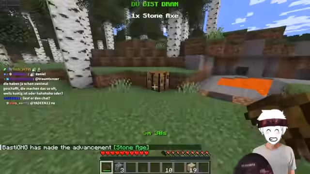 03:14:43Der Streamer startet eine neue Runde mit dem Ziel, in den Nether einzusteigen und dort erfolgreich zu agieren. Die Challenge besteht darin, dass beide Spieler denselben Block abbauen müssen. Nach einem anfänglich erfolgreichen Start mit Birkenholz und der Navigation zu einem Lavasee zur Steinherstellung kommt es zu einem kritischen Fehler. Basti stattet eine Holzspitzhacke aus, während Stegi eine Axt craftet, was zu einer Verzögerung und einem Hungerproblem bei Stegi führt. Der Run wird daher als gescheitert betrachtet.