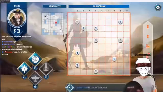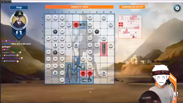 03:40:46Der Stream wechselt nun zum Spiel 'Schiffs versenken', auch bekannt als Battleship, wobei eine Runde als Testspiel geplant ist. Streamer und Gegner discussieren über die Ultimates der verschiedenen Spielfiguren und analysieren deren Fähigkeiten, wie z.B. den Luftangriff oder den Torpedo. Nachdem eine Auswahl getroffen wurde und die Schiffe platziert sind, beginnt das Spiel. Der Gegner, Basti, platziert seine Schiffe sehr strategisch, was eine Herausforderung darstellt. Der Streamer beginnt mit dem Angriff und schießt auf eine Position, die ihm Informationen über den Gegner liefern soll, auch wenn es nur ein Blindgänger ist.