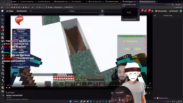 04:07:34Die Aktivitäten im Nether konzentrieren sich auf die Suche nach Ressourcen wie Raketen, Schienen und Angel. Es gibt mehrere Absprachen, wer welche Materialien beschafft, wobei das Problem der begrenzten Ressourcen, insbesondere an Raketen, immer wieder thematisiert wird. Eine kritische Situation entsteht, als der Streamer feststellt, dass er keine Raketen mehr hat und Teammitglieder sich um die Beschaffung bemühen müssen.