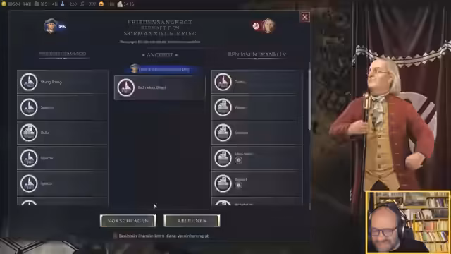 03:38:56Benjamin Franklin bietet dem Streamer eine Stadt namens 'Tad Mekka' im Austausch für Frieden an. Zunächst scheint dies ein einfacher Weg zu sein, das Spiel zu gewinnen, da die Missionierung der Stadt wertvolle Punkte bringen würde. Der Streamer ist jedoch verunsichert, da er nicht weiß, ob die Stadt in der Neuen Welt liegt. Nach kurzem Zögern wird das Angebot zurückgezogen, was zu großer Frustration führt. Der Versuch, einen Gegenvorschlag zu machen, scheitert ebenfalls, was den Streamer einen Bug vermuten lässt. Die Chance auf einen schnellen Sieg ist dahin.