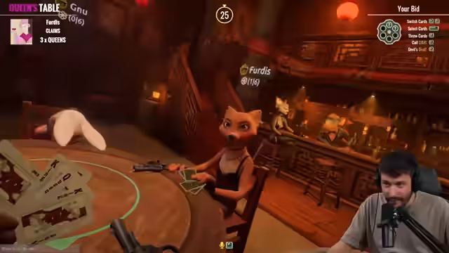 00:47:39Es wird Liars Bar mit Furdis, Maxify und Gnu gespielt. Der Streamer fragt, was gespielt werden soll und erwähnt das Laias Update. Es wird festgestellt, dass es warm ist. Der Streamer kündigt ein Interview an und entschuldigt sich für einen Handwerker im Hintergrund. Es wird überlegt, ob ein neuer Spielmodus oder nur neue Charaktere im Update enthalten sind. Der Streamer hofft, dass den Zuschauern die entspannte Momme-Session gefallen hat. Es wird überlegt, welches Tier genommen werden soll. Der Streamer nimmt den Tiger. Es wird erklärt, was neu bei Liar's Deck 2 ist: Wenn man beim Lügen erwischt wird, wird die Runde nicht resettet, sondern weitergespielt. Es gibt den Teufelsdeal, bei dem man sagt, dass die letzten vier Karten die Wahrheit waren. Wenn man Recht hat, müssen alle anderen die Knarre ins Gesicht halten. Es gibt auch die Joker-Runde, wo nur ein paar sichere Karten im Spiel sind. Furtis hat sich verändert. Es wird in die neue Bar gegangen. Es wird erklärt, wie die Mikros ingame ausgemacht werden. Es wird sich gegenseitig gemutet.