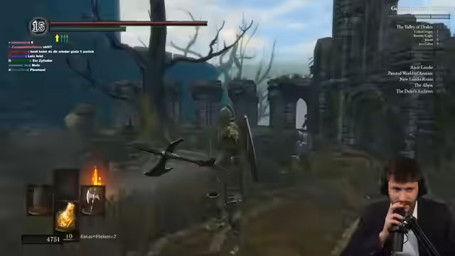 00:12:51Der Streamer betritt Neulondo und stellt fest, dass die Gegend weniger stressig als erwartet ist. Er holt sich die Riesenglut und nutzt den Wanderfluch-Zauber, um Geister effizient zu bekämpfen. Die Community hilft bei der Zeitverwaltung für den Zauber, der fünf Minuten hält. Der Streamer zeigt sich erleichtert über das erfolgreiche Vorankommen in diesem Bereich.