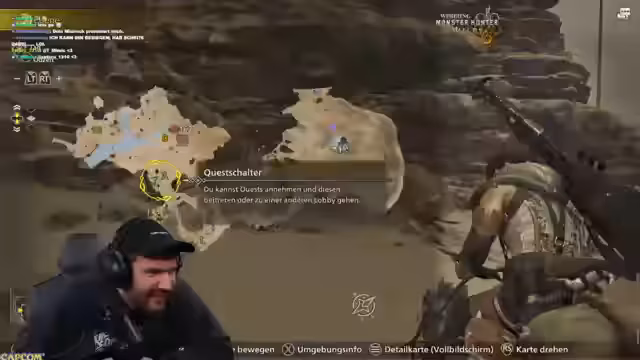 02:12:09Die Gruppe bespricht, welche Quests noch fehlen und wie sie diese abschließen können, um für die Community beizutreten. Die Rankenfalle, das Fangen eines Monsters, das Töten des Crematis, das Finden eines Monsternests und die Weibernmünze wurden bereits erledigt. Es fehlen noch das Fotografieren von vier Sachen, die Sandgrube und das Braten. Das Gruppenfoto soll als letztes gemacht werden. Sterzik soll das Braten gezeigt werden, damit alle auf dem gleichen Stand sind. Es wird erklärt, dass die Sandgrube schwer zu erreichen sein wird. Dalu spoilert, dass die Grube erst später im Spiel zugänglich ist. Sterzik muss noch zehnmal ein perfektes Steak braten, vier Fische fangen, angeln, das Gruppenfoto machen und verschiedene kleine Monster fotografieren. Es wird diskutiert, wie man den Fotoapparat benutzt und was man fotografieren soll. Sterzik soll verschiedene kleine Monster fotografieren, um die Quest abzuschließen. Es wird besprochen, ob Sterzik mit oder ohne HD-Pack spielt. Die Gruppe startet die Quest erneut und Dalu soll die Sandgrube finden. Sterzik soll seine Sachen ablegen und die Gruppe zeigt ihm, wie man Steaks brät. Er soll die Viecher töten und looten, um rohes Fleisch zu erhalten. Die Gruppe sucht nach der Sandgrube und stellt fest, dass sie möglicherweise die Story weiterspielen müssen, um sie zu finden.