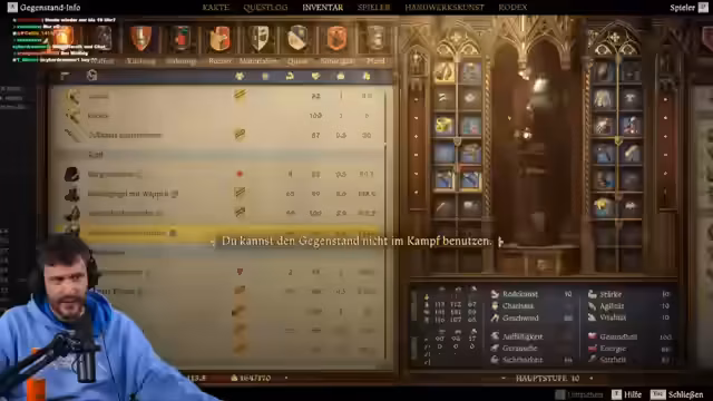 02:36:44Aufgrund der übermäßig großen Menge an Beute muss der Streamer nun seine Taschen leeren. Er reist zum nächsten Händler, um seine Rüstung und Kleidung zu verkaufen, und ist dabei unzufrieden mit den angebotenen Preisen. Nachdem er die Sachen abgegeben hat, widmet er sich dem Level-Up seines Charakters. Er verteilt seine Spezialisierungspunkte strategisch auf Fertigkeiten wie Schwertkampf, Überleben, Alchemie und Reiten, um seine Kampfkraft und seine Fähigkeiten im Umgang mit Tränken und Pferden zu verbessern.