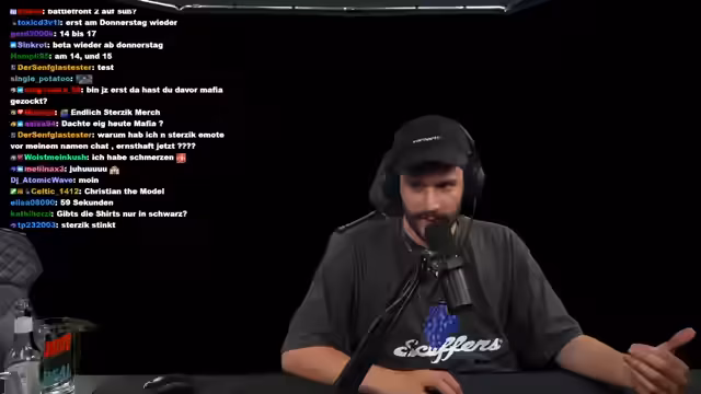 01:58:54Der Streamer wechselt das Thema und kündigt Pläne für den Rest des Tages und den Folgetag an. Er erklärt, dass das aktuelle Spiel Mafia unterbrochen wird und erst am Nachmittag des nächsten Tages fortgesetzt wird. Der Fokus liegt dann auf Battlefield. Der wichtigste Ankündigung ist der bevorstehende Merch-Drop. Er bewirbt seinen neuen Shop strzk-shop.de, der am nächsten Tag um 16 Uhr startet und exklusive Shirts und einen gratis Stickerbogen für Käufer anbietet.