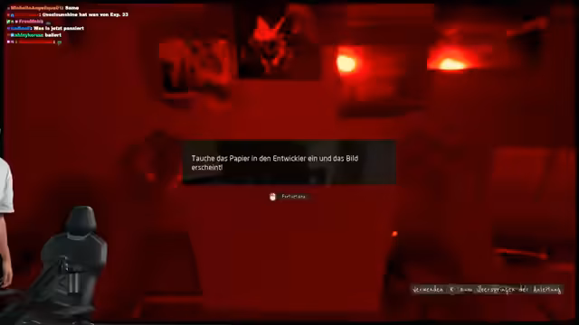 01:51:12Der Streamer erfährt, dass Fotos mit drei Bädern entwickelt werden: dem Entwicklungsbad, der ersten Spülung und dem Fixierbad, gefolgt von einer zweiten Spülung im Spülbecken. Während des Prozesses hat er das Gefühl, jemanden gesehen zu haben und fragt sich, ob der Stuhl schon immer da stand. Er schiebt es auf die Situation, die ihn Dinge sehen lässt, die nicht existieren. Anschließend soll er ein Selfie für einen Rahmen machen und fragt sich, ob er es im Haus oder draußen machen soll. Er entdeckt eine Karte, die eine Open World andeutet. Die Frage nach dem Geruch einer Leiche nach ein bis zwei Tagen wird im Chat beantwortet. Schließlich macht er ein Selfie am Fenster mit einem Stativ, das er als 'weird' bezeichnet, und entwickelt das Bild von sich selbst. Er fotografiert auch Martha, obwohl er unsicher ist, ob dies heutzutage noch üblich ist, und bemerkt einen grünen Bereich auf dem Bildschirm, der die Belichtung anzeigt.