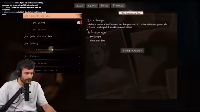 02:06:42Der Streamer glaubt, Martha am Baum gesehen zu haben und versucht, ein Foto zu machen, was sich aufgrund der Dunkelheit als schwierig erweist. Er entdeckt einen SS-Helm und fragt sich, warum er dort liegt. Er muss geradeaus und dann rechts gehen und entschuldigt sich für ein Niesen. Er findet weitere Lampen und nimmt sie mit. Die Mission ist es, alte Kameras am See zu finden. Er findet die Kameras und entdeckt ein rotes Tuch. Er soll ein Foto davon machen, und es stellt sich heraus, dass es das rote Tuch aus dem Keller sein könnte. Er überlegt, ob er nach Hause gehen oder mit dem Boot davonfahren soll. Plötzlich wird es dunkler, und er befindet sich in einem Schützengraben. Das Spiel scheint zu buggen, da er sich nicht bewegen kann. Er äußert seine Enttäuschung über das Spiel, da es ihm zu anstrengend ist und er nicht wirklich warm damit wird. Er hofft, dass es noch spannender wird.